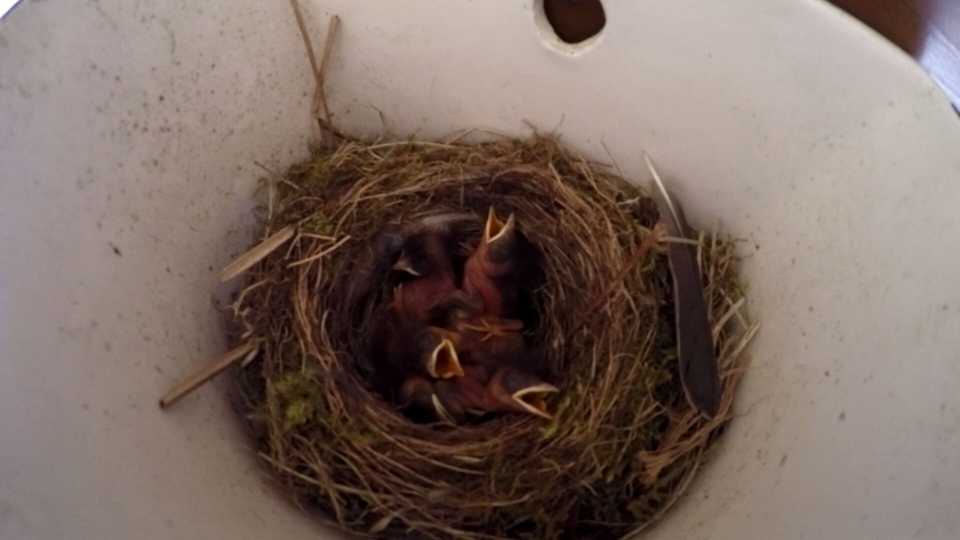 Schon der Nestbau war speziell, nämlich in einem Blumentopf genau über der Eingangstür. Nun sind die kleinen Rotschwänzchen(5?) hungrig und wir müssen uns bei der Fütterung hinters Haus verziehen.